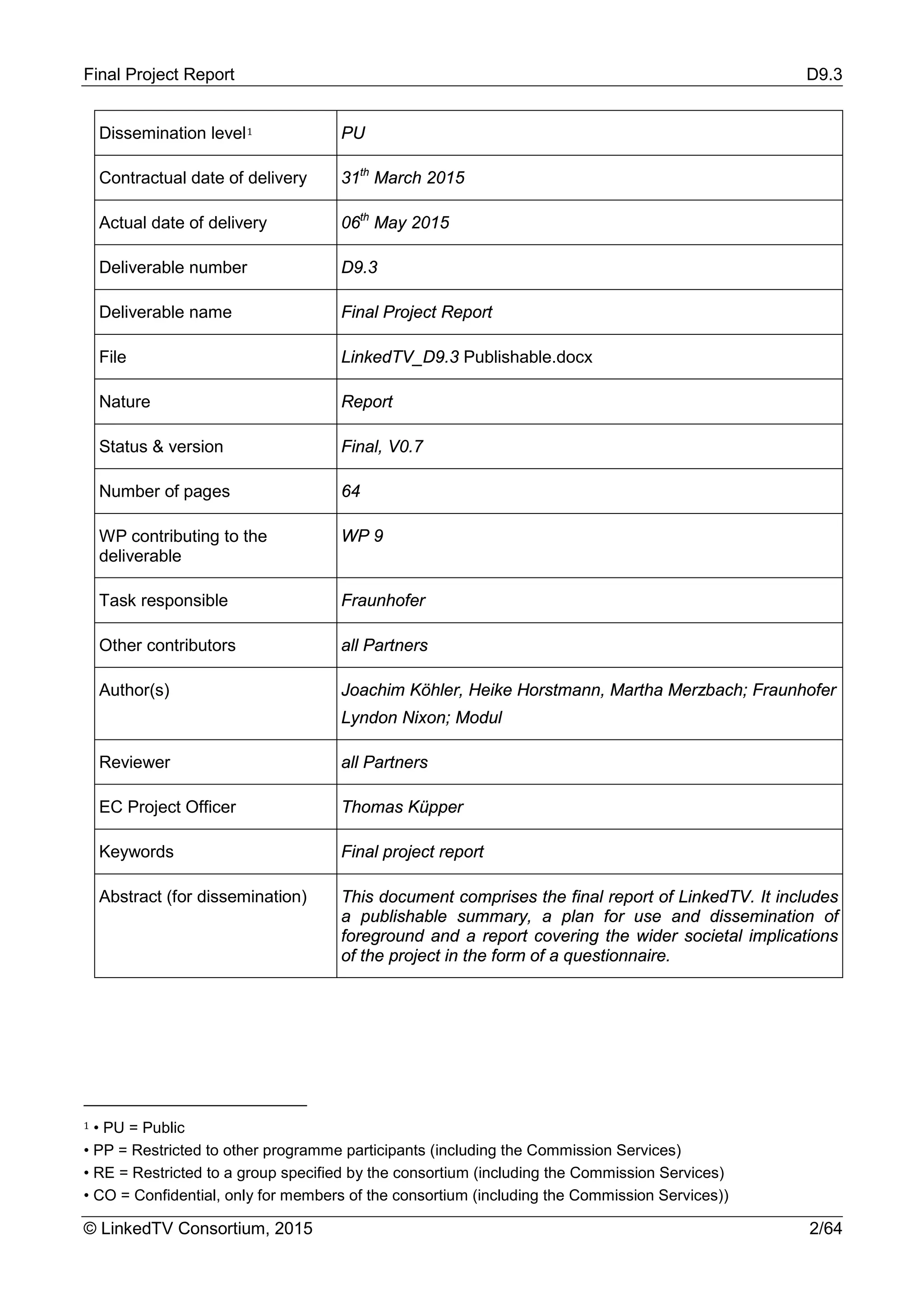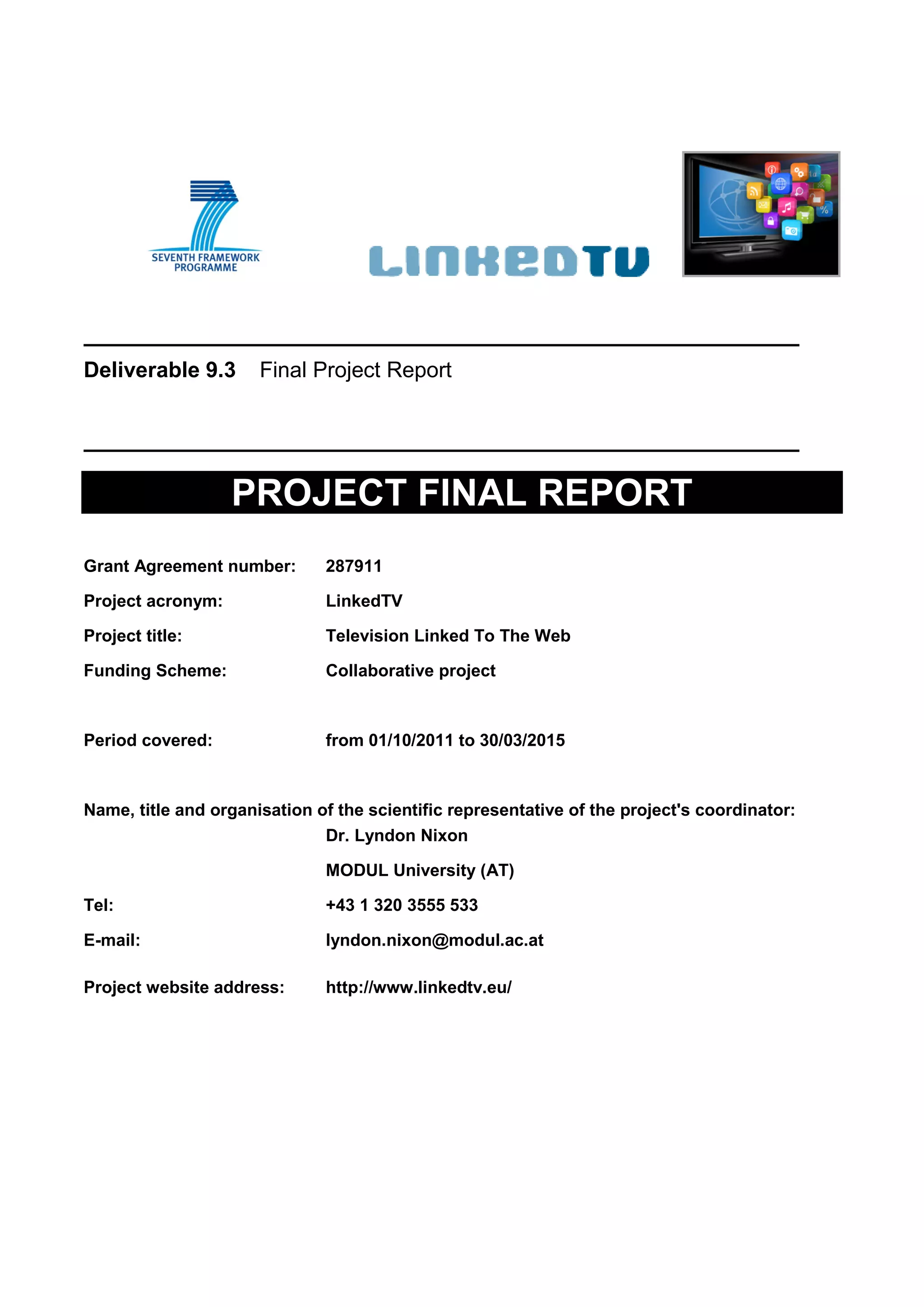 The LinkedTV project final report outlines the outcomes of a collaborative effort from 2011 to 2015, aimed at integrating television with web content to enhance viewer experience through a platform developed for media analysis, annotation, and personalization. Key achievements include a set of tools and services designed for broadcasters and content owners to automate content enrichment and personalize viewer interactions. The project emphasizes the importance of technological dissemination and user engagement to foster adoption in the evolving television landscape.