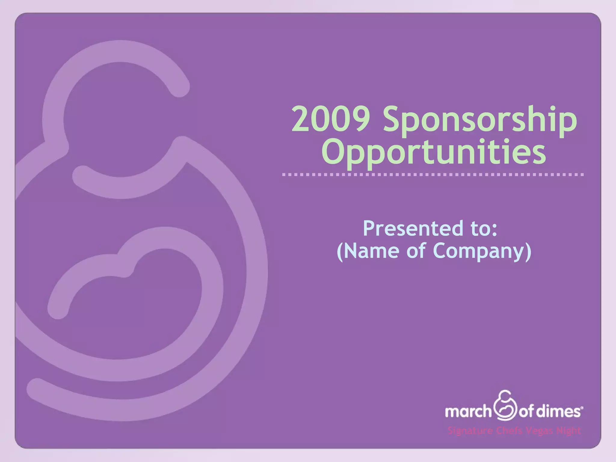 The document is a sponsorship proposal from the March of Dimes presented to a company. It outlines various sponsorship opportunities for an upcoming event called Signature Chefs Vegas Night, including presenting sponsor, ambassador family sponsor, and game table sponsor. The proposal details the benefits of each sponsorship level, such as number of tickets, advertising, and recognition. It concludes with a partnership agreement for the company to sign to confirm their sponsorship.