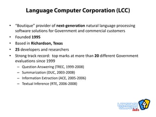 Language Computer Corporation provides customizable natural language processing software solutions. It has developed several information extraction systems over the years, including named entity recognition, relationship extraction, event extraction, question answering, and summarization. Its most recent system, CiceroCustom, allows users to easily create custom extractors for any type of entity, attribute, or event within minutes using an active learning approach. This provides more flexibility than traditional extraction methods.