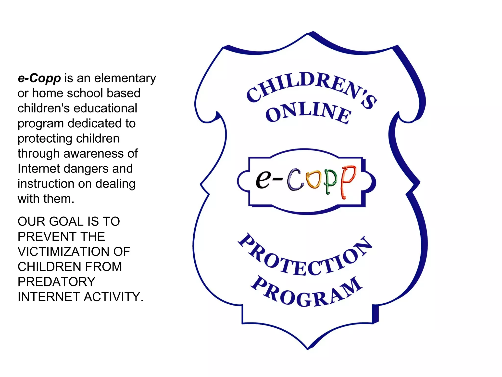 A company called e-Copp, founded by police officers and mothers, created an educational program to teach children about internet dangers and how to stay safe online. Their goal is to prevent child victimization from online predators. They provide an example of a child who reported abuse to a school counselor after gaining courage, and e-Copp aims to be the catalyst that empowers children in this way. They ask people to help their mission by promoting e-Copp on their own websites and encouraging schools to adopt the program, and by spreading awareness on social media.