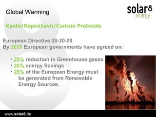 Solar 8 Energy AG is preparing to issue a €10,000,000 public bond at 9.25% in March 2011 to finance a €43,000,000 investment in solar energy projects in Italy. The company aims to build a minimum of 11.5 megawatts of additional solar capacity in Puglia and has an experienced executive team with backgrounds in technology, law, and investment. The project is supported by the Italian government's attractive subsidy program for renewable energy.