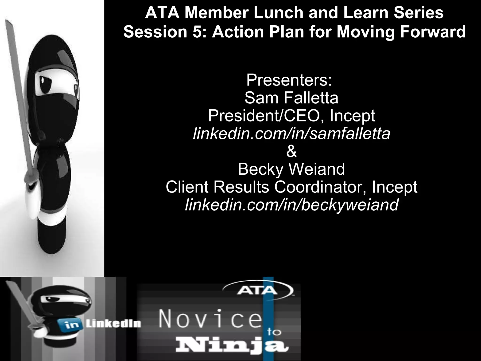 The document outlines an action plan for users to maximize their LinkedIn profile and engagement over different time periods. It recommends that users today complete their profile, join groups, post and answer questions, and add connections. Within two weeks, users should have 15 connections, joined 10 groups, provided recommendations, and engaged with groups. Going forward, users should log in 2-3 times per week to check updates, answer questions, and post one question weekly to further their LinkedIn engagement and networking.