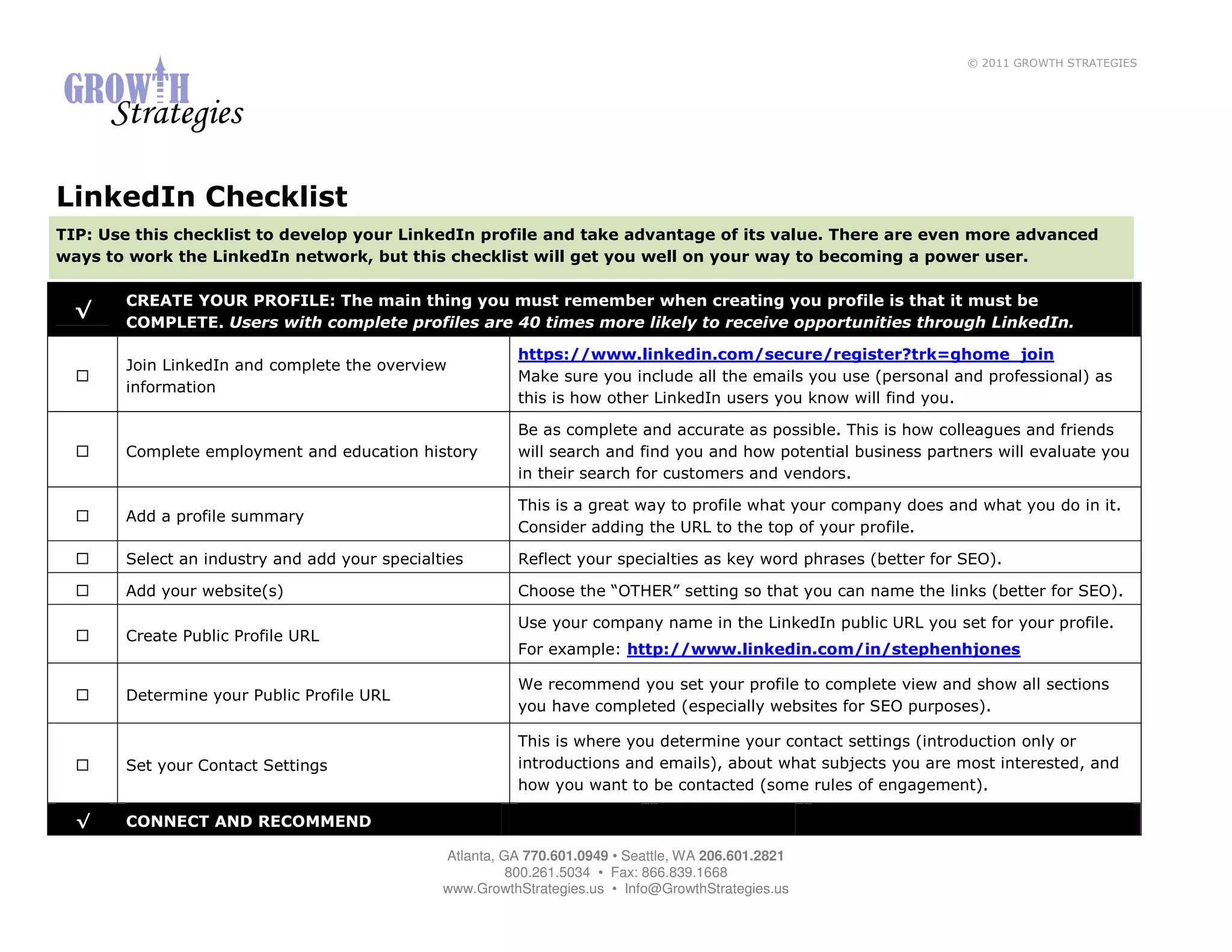 This document provides a comprehensive checklist for optimizing a LinkedIn profile, emphasizing the importance of completing your profile, connecting with contacts, and engaging with the network. Key strategies include creating a detailed profile, inviting personal connections, asking for recommendations, participating in Q&A, joining relevant groups, and maintaining regular interaction with the platform. It also advises on using LinkedIn's advertising features and ensuring your LinkedIn presence is visible across various media.