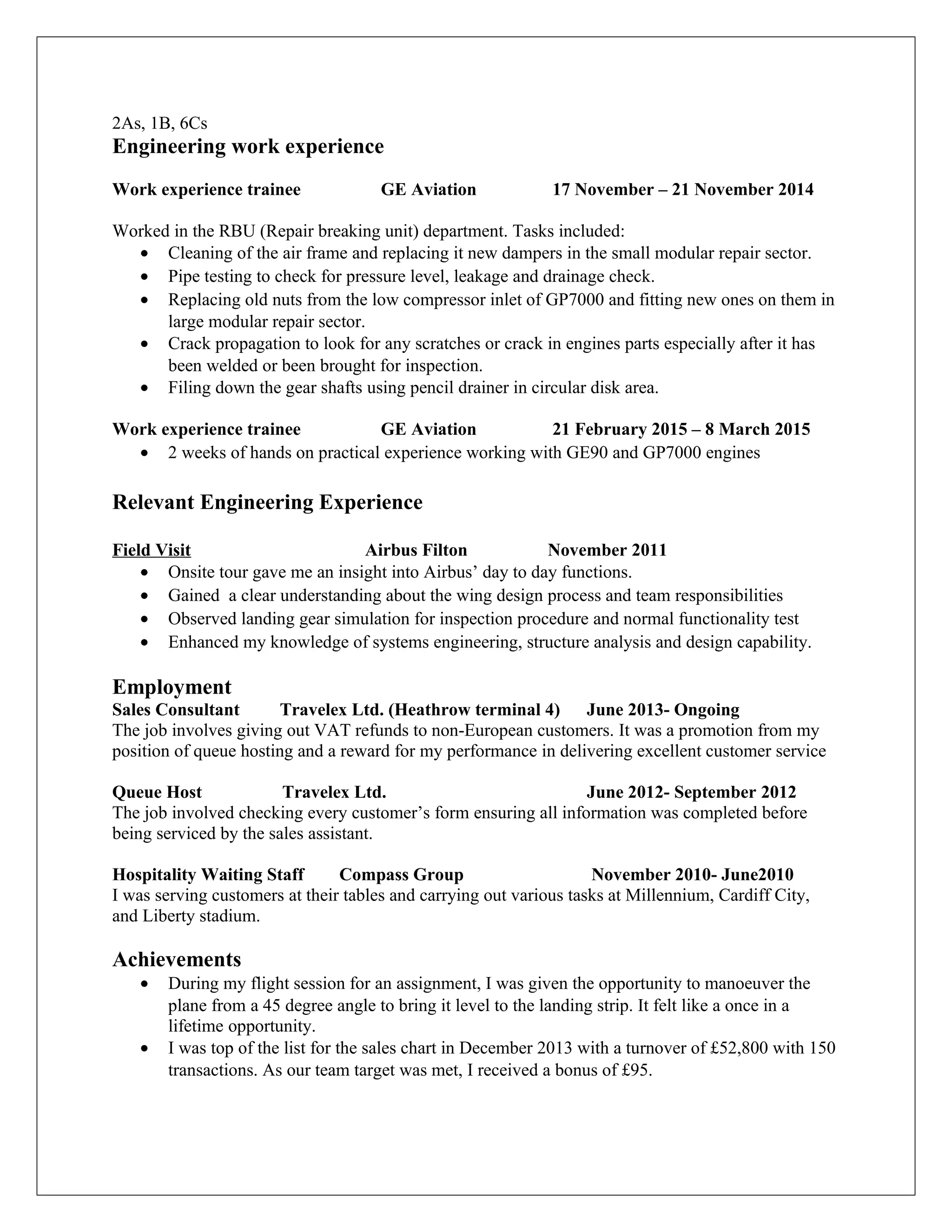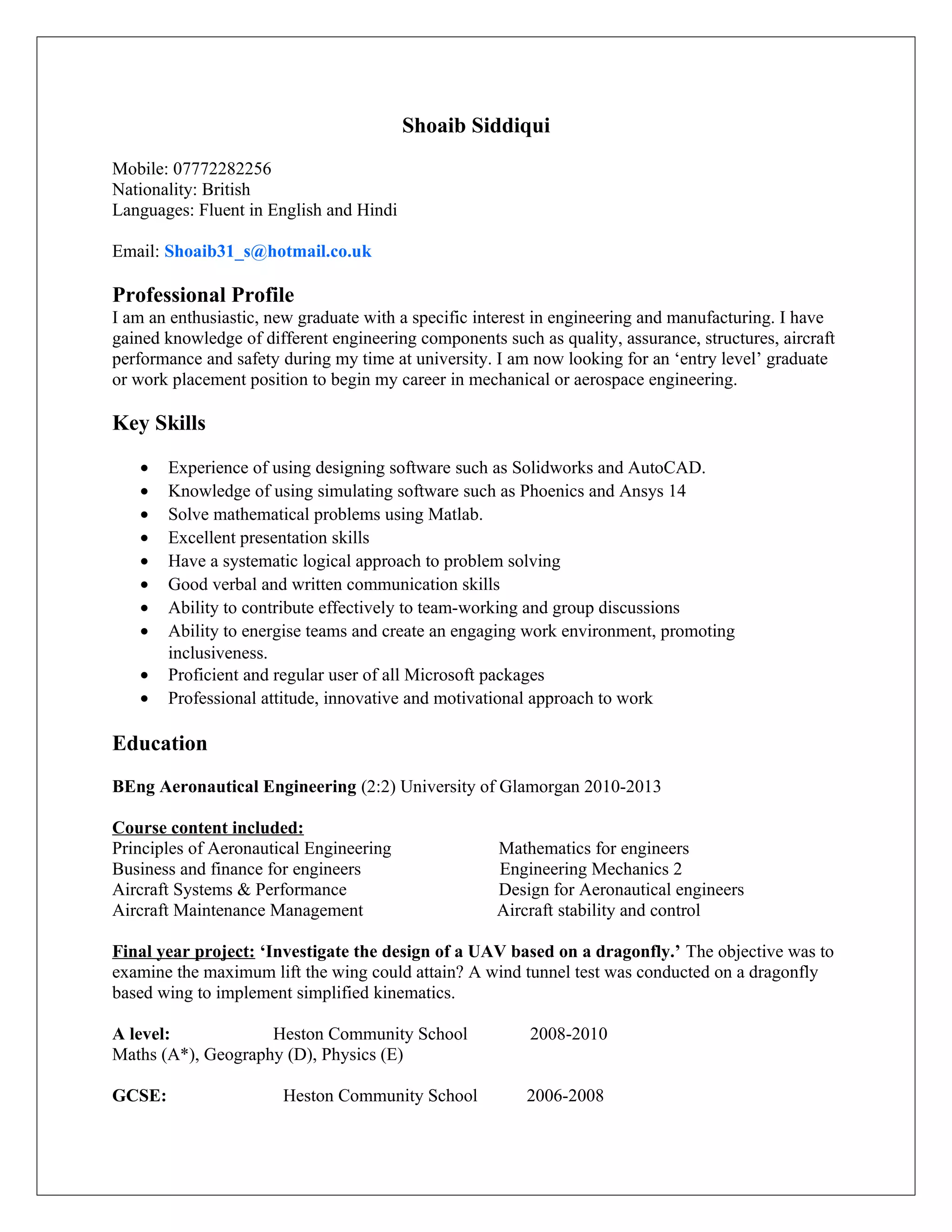 Shoaib Siddiqui is a British national seeking an entry-level position in mechanical or aerospace engineering. He has a BEng in Aeronautical Engineering from the University of Glamorgan and experience using design and simulation software like Solidworks, AutoCAD, Phoenics, and ANSYS. He also has engineering work experience at GE Aviation and Airbus.