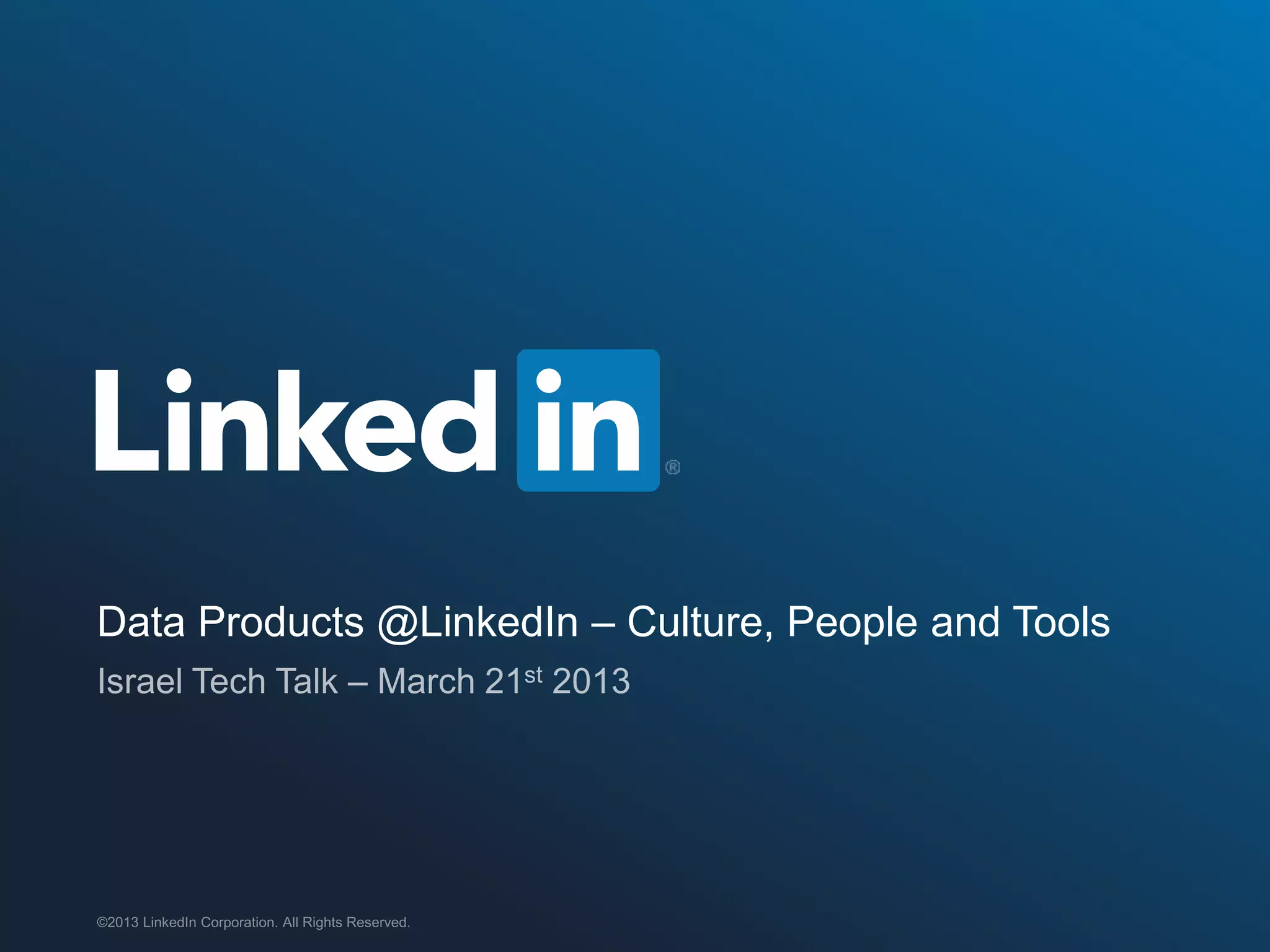 The document discusses LinkedIn's approach to data products, emphasizing the importance of culture, people, and tools in their development. Key principles include the notion that all aspects should be seen as data products, the necessity of measurable success metrics, and fostering talent among data scientists. It also highlights the investment in infrastructure and the use of open-source tools to enhance data product functionality.