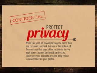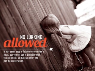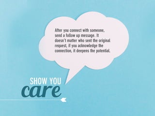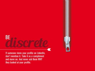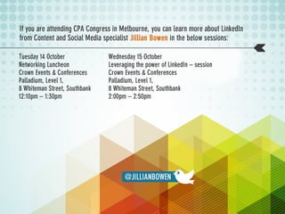 The document provides etiquette and best practice tips for maximizing your LinkedIn experience, emphasizing the importance of personalization in connection requests and follow-up messages. It advises on content sharing, responding to messages, maintaining professionalism, and nurturing connections while protecting privacy. Additionally, it encourages active participation and offers details about upcoming LinkedIn-related sessions at the CPA Congress in Melbourne.