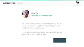 This document outlines a LinkedIn workshop led by Ahmed Barkhia, aimed at helping individuals enhance their virtual identities and career visibility through effective LinkedIn use. It covers topics such as creating a compelling profile, understanding endorsements and recommendations, and leveraging LinkedIn groups for networking. The workshop emphasizes personal branding, strategic content creation, and actionable steps for optimizing LinkedIn profiles to attract the right audience.
