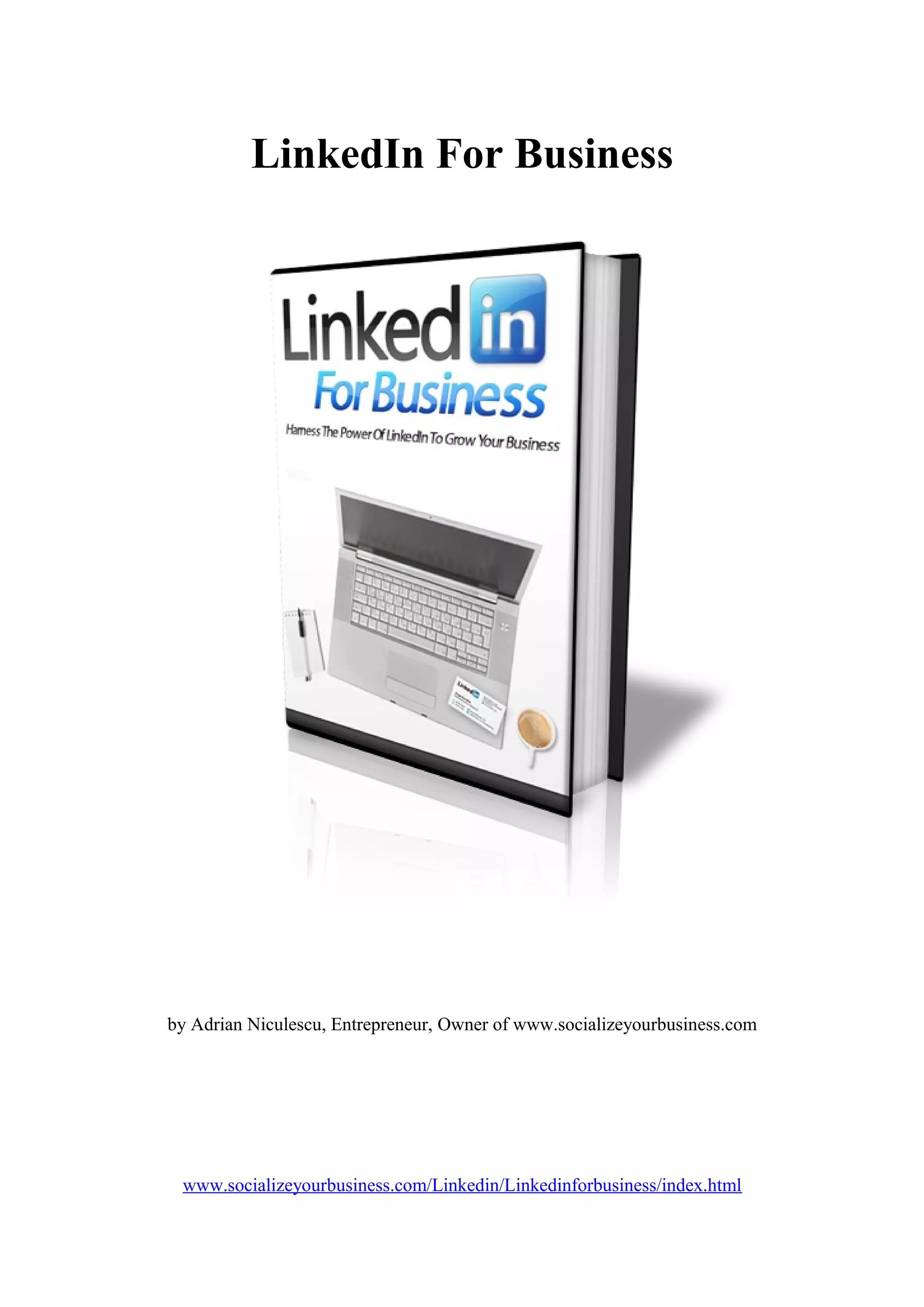 This document provides an overview and guide for using LinkedIn for business purposes. It discusses setting up a LinkedIn business page and optimizing the page for search engines and traffic. It also covers using LinkedIn tools for business such as adding products, recruitment, contact building, events, and analytics. Additional sections provide guidance on using LinkedIn for brand building, interaction tools like groups, and driving traffic to an external website. The document is intended as a step-by-step guide for businesses to maximize their use of LinkedIn.