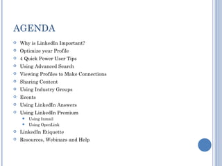 The document provides tips on how to use LinkedIn effectively for professional and career success. It recommends optimizing your profile, using advanced search features, engaging with industry groups, sharing content, and using premium account features like InMail to connect with others in your industry. The document also warns against spamming connections and provides resources for learning more about using LinkedIn.