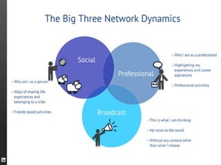 This document provides tips on using LinkedIn to enhance one's career opportunities. It recommends completing your profile with relevant experience and skills, growing your professional network, following companies you want to work for, joining relevant industry groups, and engaging with your connections to maximize your visibility to recruiters on LinkedIn.