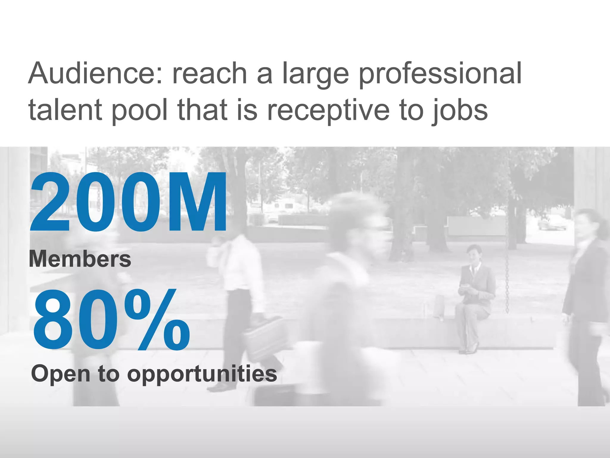 This document promotes the LinkedIn jobs network, highlighting that it allows companies to post jobs to a network of over 200 million professionals, 80% of whom are open to new opportunities. It notes that posting a job on LinkedIn exposes it to a large, qualified talent pool and that jobs are further distributed through employees' extended networks for increased reach and referrals. Companies are also able to target and contact qualified candidates whether they are actively looking or not.