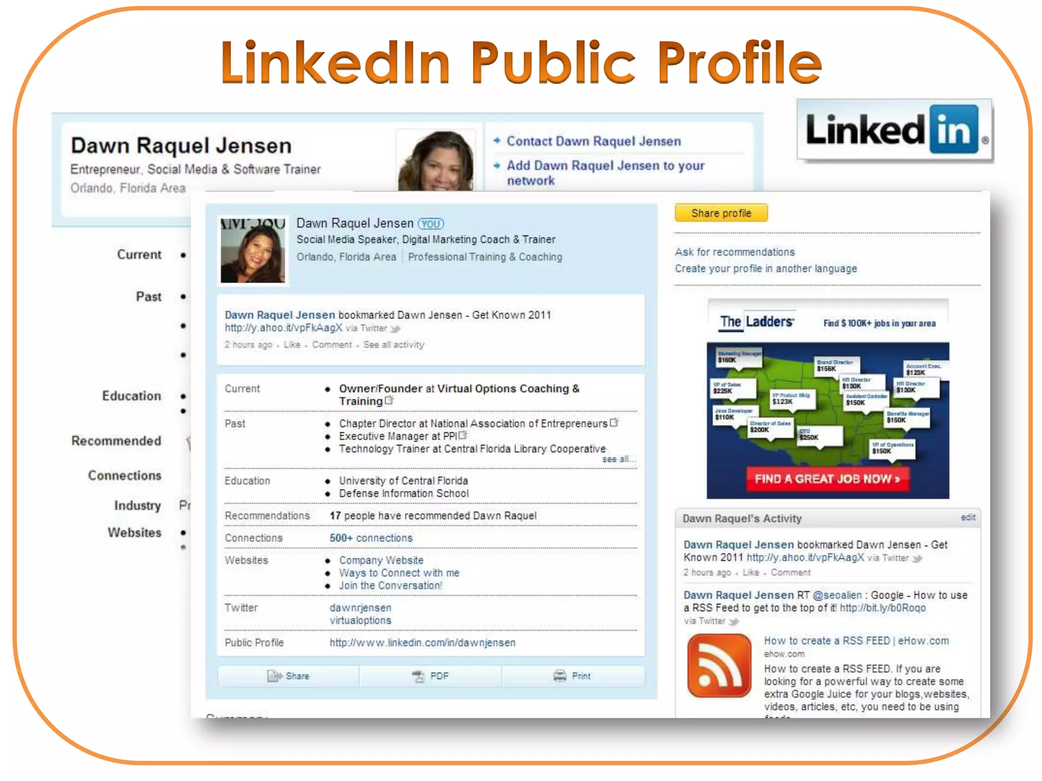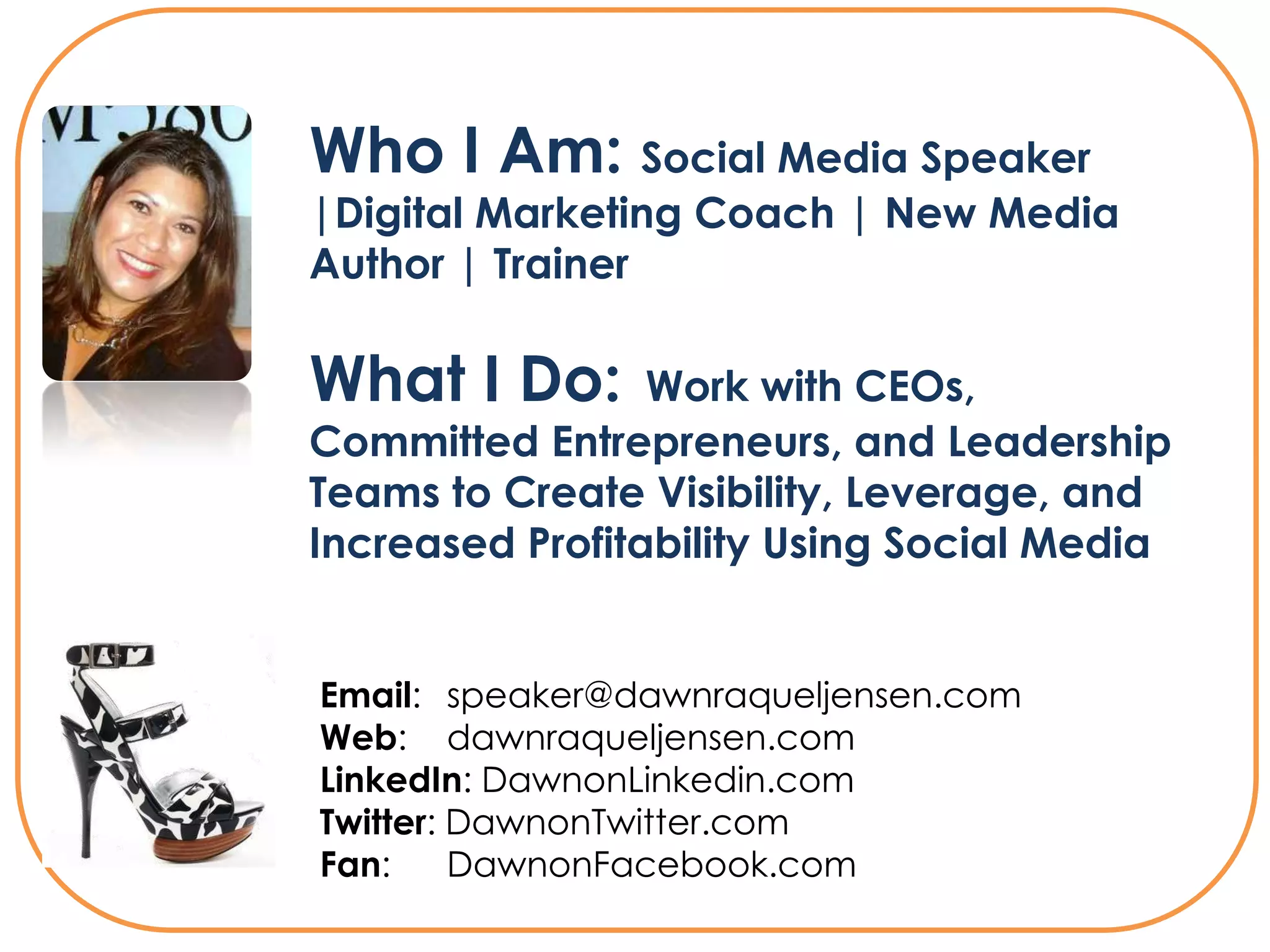 The document introduces Dawn Raquel Jensen, a social media speaker and digital marketing coach, detailing her services for CEOs and entrepreneurs to enhance their visibility and profitability through social media. It emphasizes the importance of LinkedIn as a professional networking tool and outlines best practices for optimizing LinkedIn profiles and leveraging networks. Additionally, it offers information on available social media workbooks and sessions to assist businesses in their social media strategies.