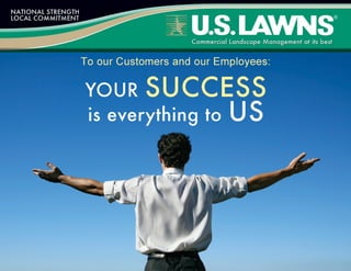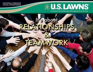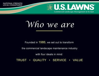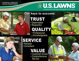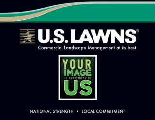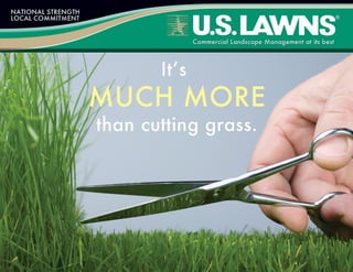 U.S. Lawns is a local landscape management company that services over 30 states and provides services to a variety of commercial properties including office complexes, retail centers, medical facilities, and more. They offer comprehensive landscape management including mowing, pruning, irrigation management, fertilization, pest control, and seasonal color programs. U.S. Lawns prioritizes safety with an OSHA approved safety program and training to ensure their employees and customer properties are protected.