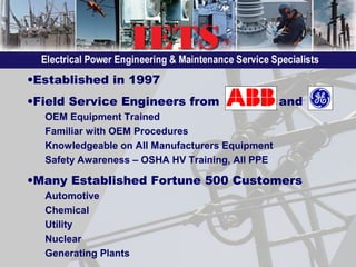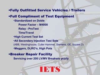 - Fully equipped service vehicles and test equipment for working on transformers, circuit breakers, switchgear and more.