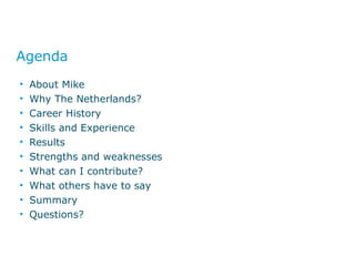 Mike Balk is a skilled sales professional with 15 years of experience in ICT sales and service delivery. He has a proven track record of driving business growth and achieving sales targets for global ICT companies. Mike's strengths include being creative in solving problems, developing opportunities, and building relationships. He has experience successfully qualifying and closing multi-million dollar deals across sectors such as government, enterprise, finance and more. References highlight Mike as expert, high integrity, and able to add exceptional value through his determination and knowledge.