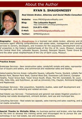 This document provides information about Ryan S. Shaughnessy, a real estate broker, attorney, and social media consultant based in St. Louis, Missouri. It includes his biography, areas of practice, and tips for using LinkedIn effectively as both a social and business networking tool, including developing a good profile, status updates, applications, and privacy settings.