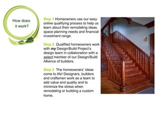 This document outlines the process and benefits of utilizing a design/build approach for remodeling or building custom homes. It emphasizes collaboration between homeowners, designers, and builders to align projects with clients' financial comfort zones and design aspirations. The service promotes effective communication through an online platform and aims to exceed client expectations through a tailored design and build experience.