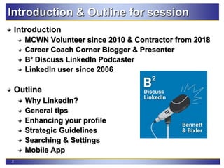 This document provides strategic guidelines for using LinkedIn effectively, focusing on enhancing profiles, networking, and job searching. It outlines the importance of creating an impactful presence through profile optimization, strategic use of hashtags and mentions, and engaging with content. The session also promotes upcoming webinars for further skill development in job search techniques.