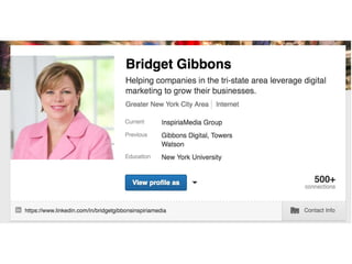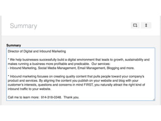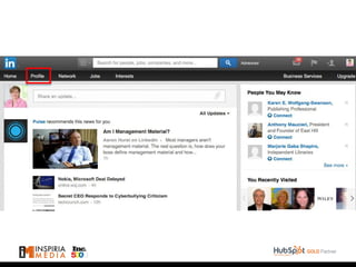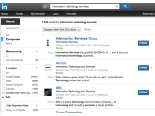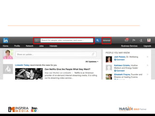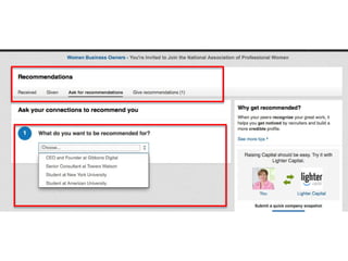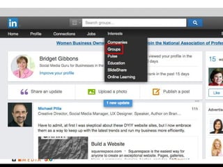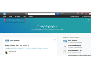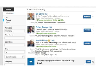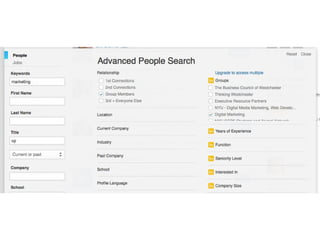 The document provides tips for using LinkedIn for networking and business growth. It discusses optimizing your LinkedIn profile for search by including keywords in your headline, experience descriptions, summary, and skills. It also recommends joining groups related to your industry, researching connections' profiles for common interests, and using the advanced search and introductions features to find and connect with potential clients. The document emphasizes regularly posting valuable updates to grow your network and brand yourself as an industry expert.