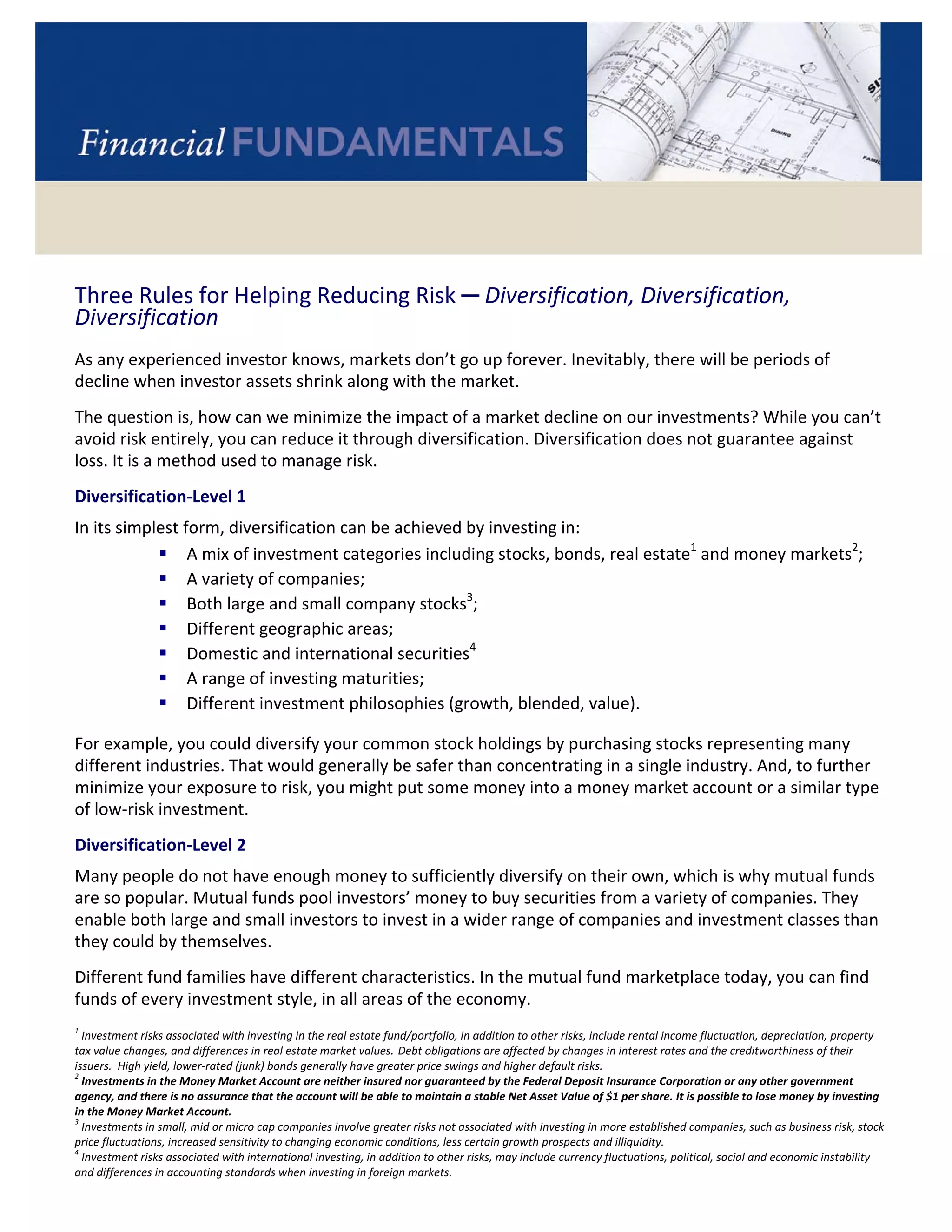 This document discusses three levels of diversification that can help reduce investment risk: 1) Diversifying across different asset classes, industries, company sizes, geographic regions, and investment philosophies. 2) Investing in mutual funds to access a wider range of investments than possible individually. 3) Strategic asset allocation, which weights conservative and growth assets to balance risk and potential returns based on goals and risk tolerance. Regular adjustments over time are recommended to align the portfolio with changing needs and goals. Diversification and asset allocation do not prevent losses but can help manage risk.