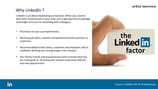The document provides tips for professionals on using LinkedIn effectively. It discusses establishing connections to gain knowledge and opportunities for promotion, recommendations, and referrals. The course covers having a professional photo and headline, writing an impactful profile summary, listing experiences and skills, getting endorsements and recommendations, asking for referrals, making your profile identifiable and searchable, and showcasing work samples. The goal is to optimize the profile to be found by recruiters and opportunities through search and connections on LinkedIn.