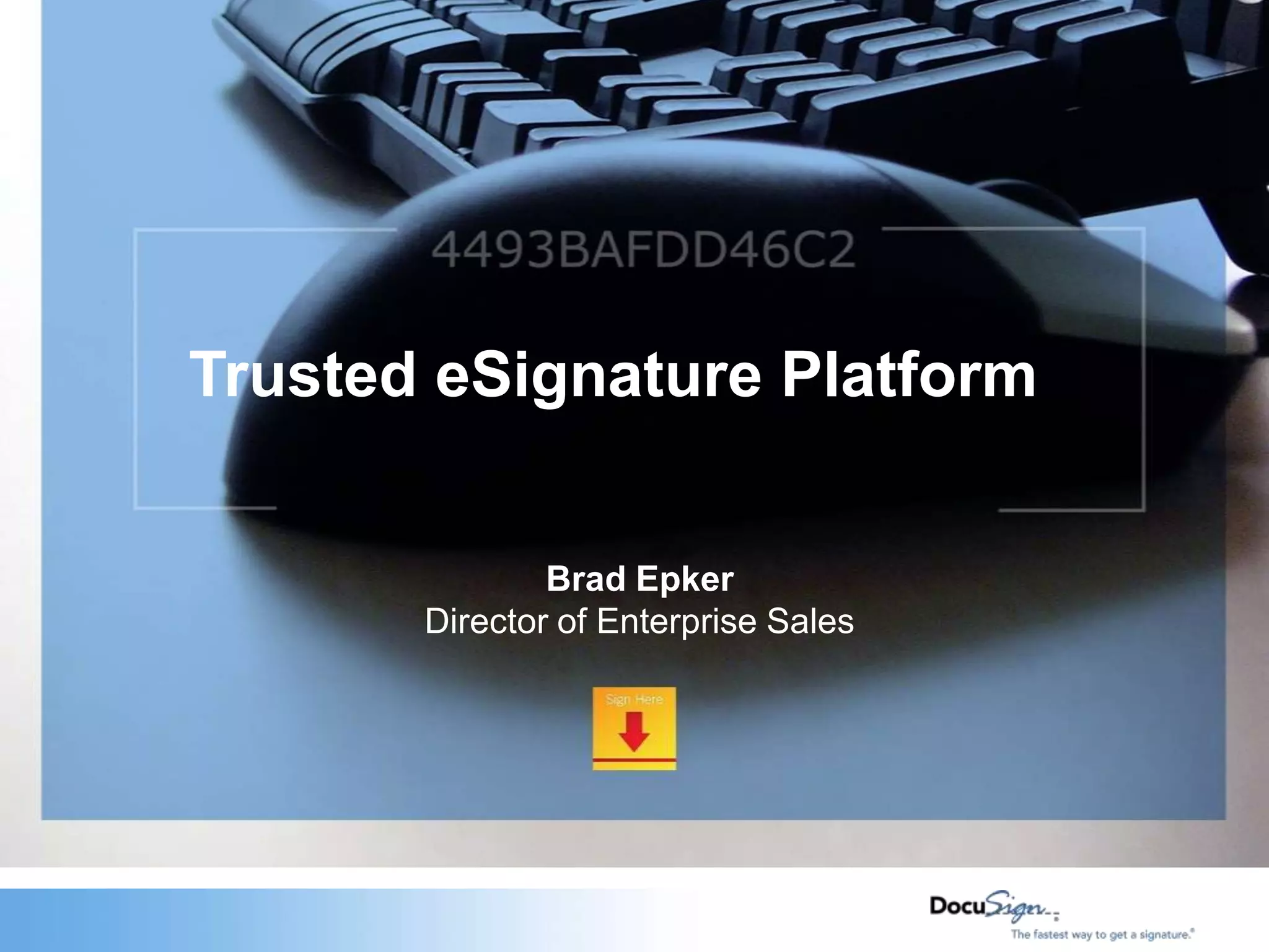The document discusses DocuSign's trusted electronic signature platform which replaces slow and manual business processes with a highly automated solution. It allows customers, suppliers, and partners to execute business transactions electronically. The platform goes beyond just electronic signatures by providing features for collaboration, workflow automation, application integration, and identity authentication. It is widely applicable across industries and transaction types. DocuSign is the leading electronic signature solution for the Fortune 500 due to its reliability, security, and ability to integrate with existing business systems.