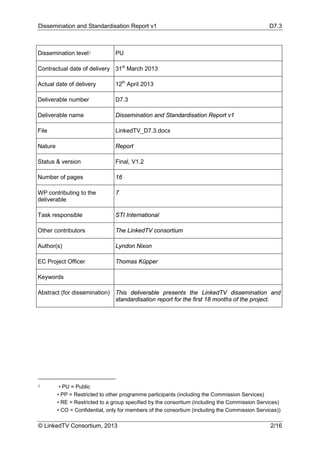 This document provides a summary of the LinkedTV dissemination and standardization activities for the first 18 months of the project. It describes the LinkedTV website, social media presence, PR materials created and distributed, participation in clustering activities and conferences, organization of events, and publications. The goal of these activities was to widely disseminate project results to relevant target groups and plan the standardization of project outputs.