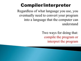 The document discusses different types of software used in the compilation and execution process of a computer program. It describes compilers, interpreters, linkers, and loaders.