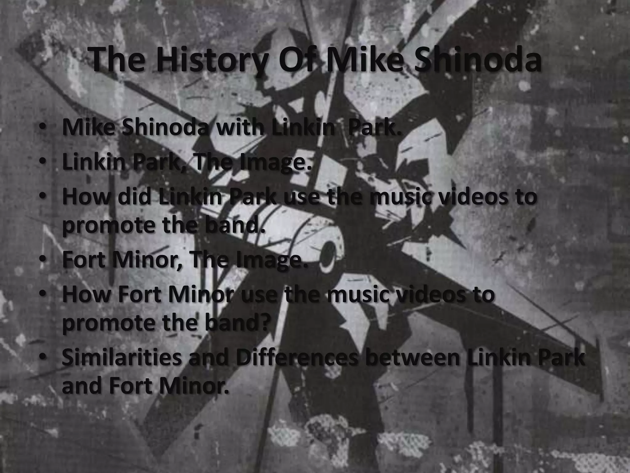 This document discusses the career of Mike Shinoda, from his beginnings with the band Linkin Park to his side project Fort Minor. It describes Linkin Park's evolution from their early albums Hybrid Theory and Meteora to their more mainstream sound on Minutes to Midnight. It also summarizes Fort Minor's only album The Rising Tied, how it featured various artists but was not intended for commercial success. Mike Shinoda created Fort Minor to represent minorities and everyday people facing struggles. While Fort Minor did not achieve the same level of fame as Linkin Park, its music videos effectively represented its messages.