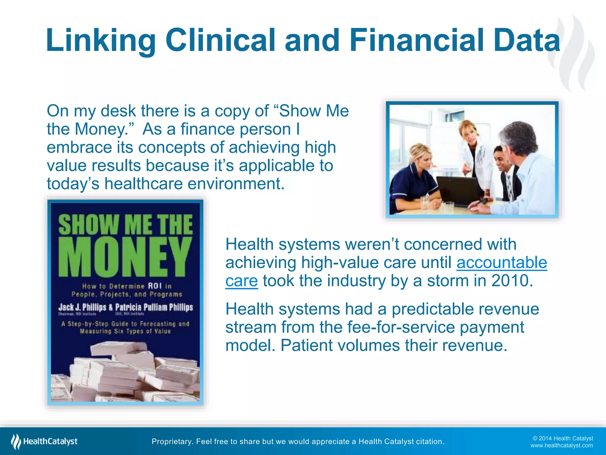 The document discusses the importance of linking clinical and financial data to achieve high-value care in healthcare systems, particularly in the context of transitioning to value-based purchasing. It outlines the key metrics that health systems must track, such as quality, readmissions, mortality rates, and patient satisfaction, as these directly impact financial performance. The use of a late-binding enterprise data warehouse and multi-disciplinary teams is emphasized as essential for improving quality and achieving cost efficiencies.