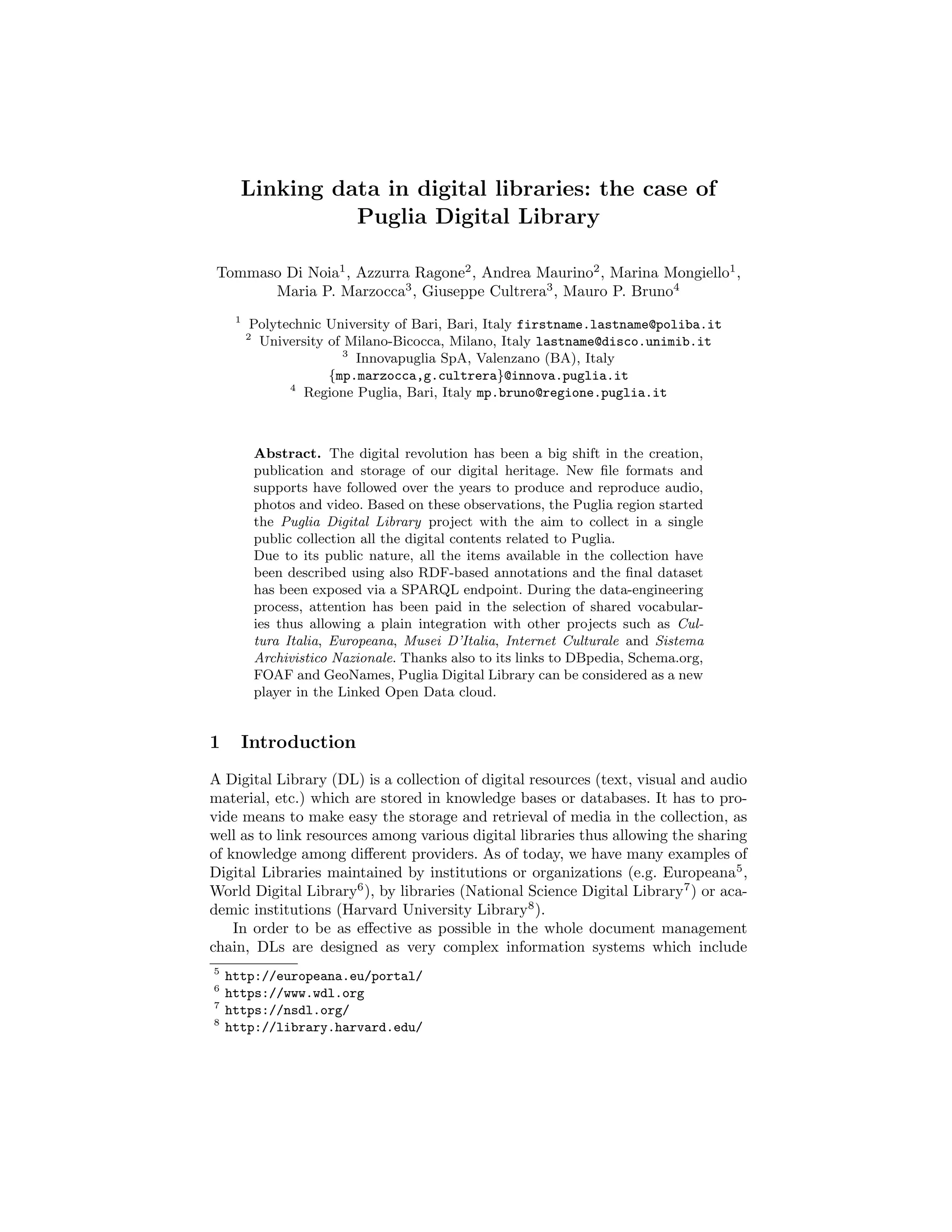 The document discusses the Puglia Digital Library project in Italy which aims to collect all digital content related to the region of Puglia in a single public collection. The project pays attention to using shared vocabularies and linking data to allow integration with other projects. By linking to datasets like DBpedia, the Puglia Digital Library can be considered a new participant in the Linked Open Data cloud.