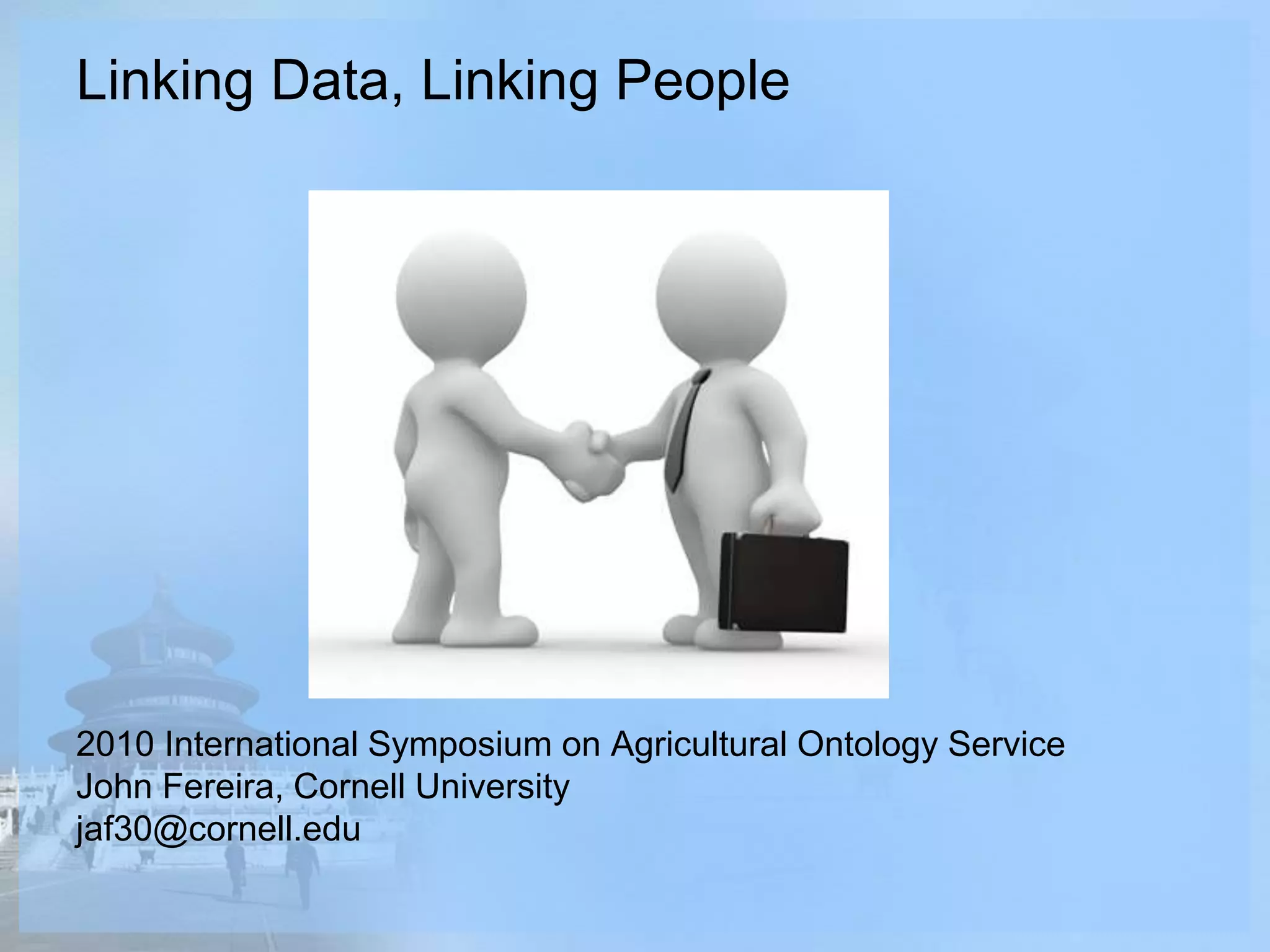 This document discusses linking data and people through ontologies and semantic web technologies. It provides examples of using RDF, FOAF, and Linked Data principles to describe people and relationships. It also showcases several applications that utilize these technologies including Vivo, a semantic publishing platform, and domain-specific knowledge environments.