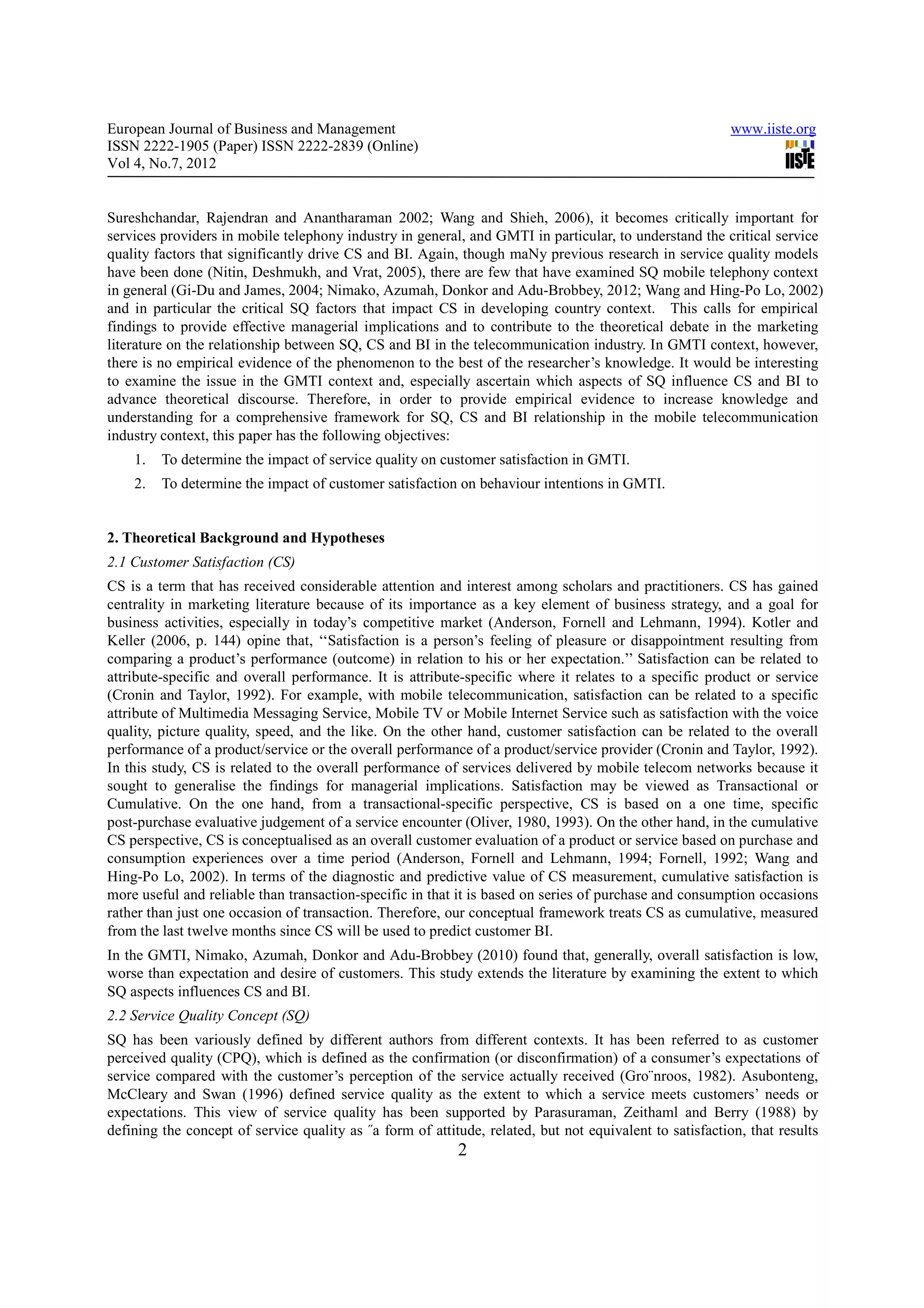This document discusses a study that examines the relationships between service quality, customer satisfaction, and behavioral intentions in Ghana's mobile telecommunications industry. Specifically, it aims to determine how different aspects of service quality (customer relations, tangibles, image quality, and real network quality) impact customer satisfaction, and how satisfaction then impacts behavioral intentions. The study is based on a survey of 1000 mobile phone users in Ghana and uses structural equation modeling to analyze the relationships. The findings indicate that the four aspects of service quality all have a positive influence on customer satisfaction, which then positively impacts behavioral intentions. The study contributes to understanding these relationships in the context of Ghana's mobile industry.