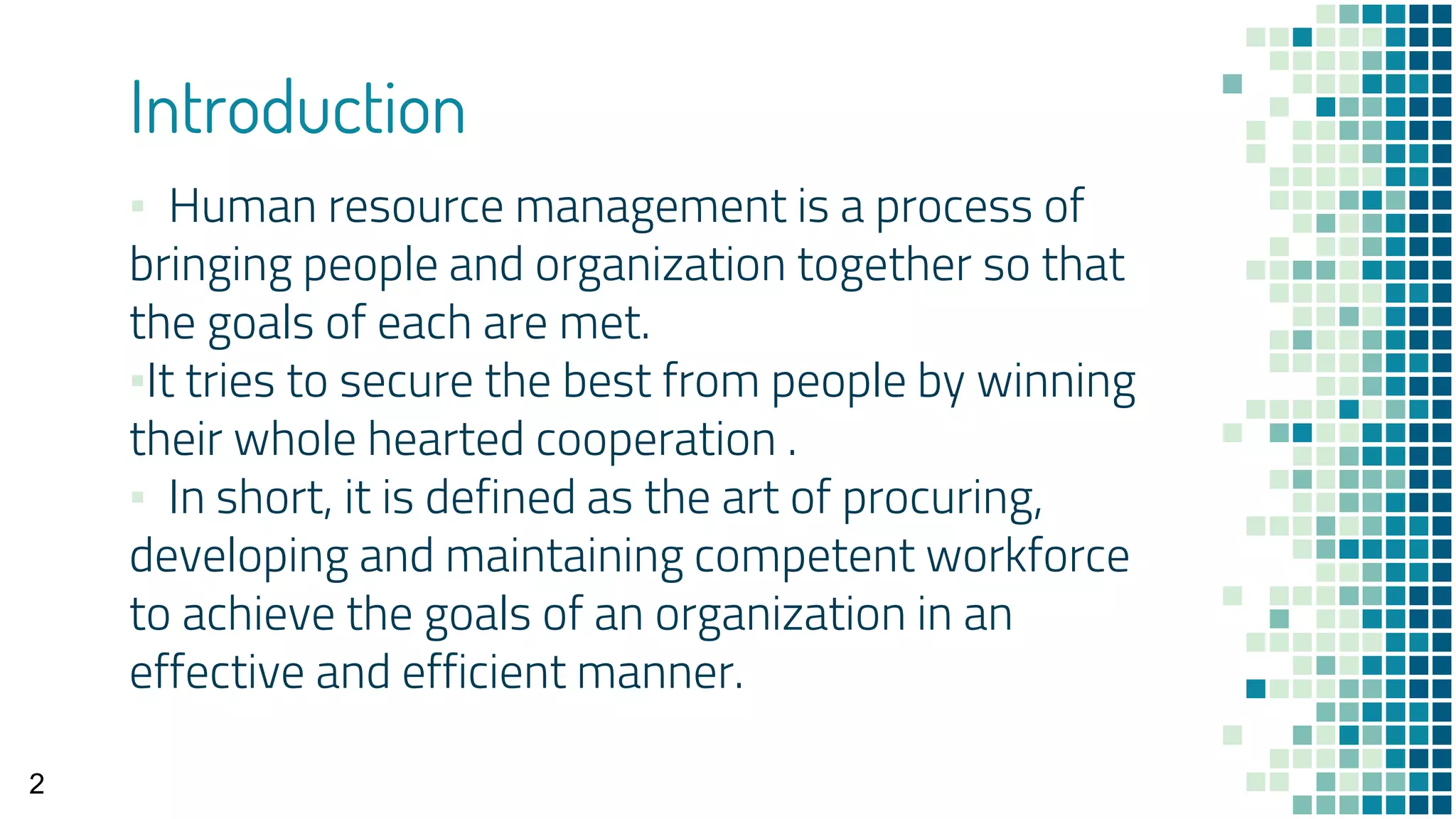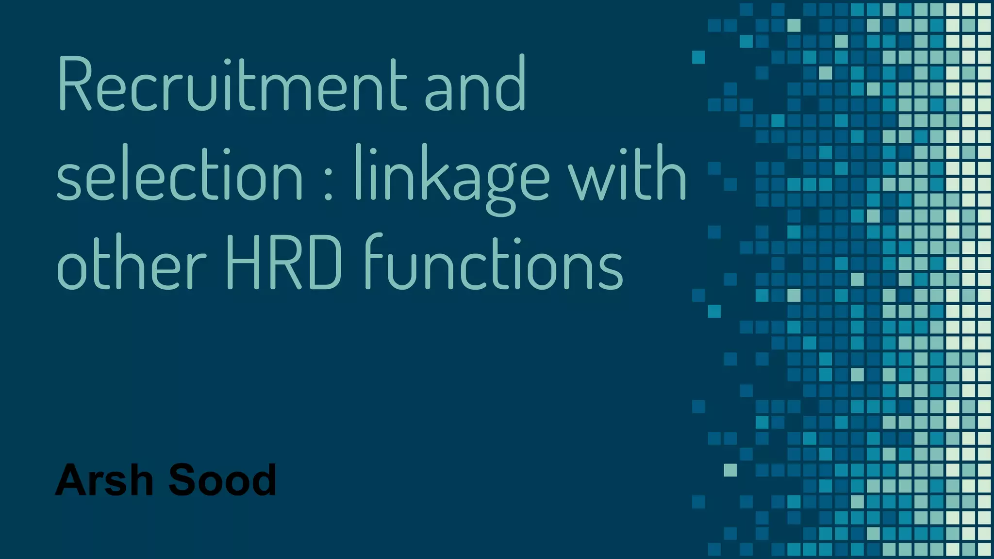 The document discusses the recruitment and selection process within human resource management and its linkage with other HR functions. It outlines the importance of planning, training, compensation, performance appraisal, industrial relations, and safety in effectively hiring qualified candidates. Successful recruitment is critical in maintaining a competent workforce and preventing potential disputes or issues within the organization.