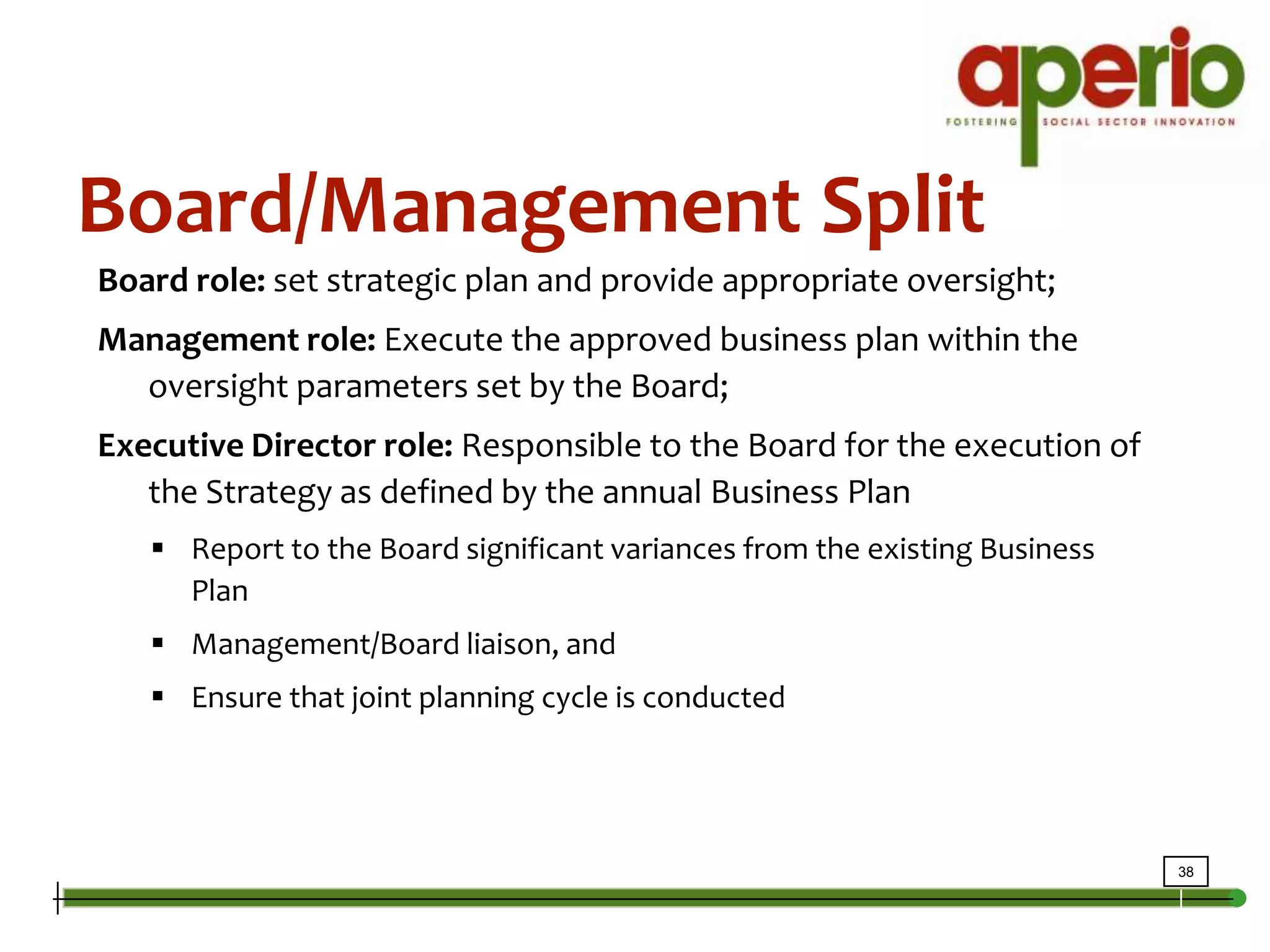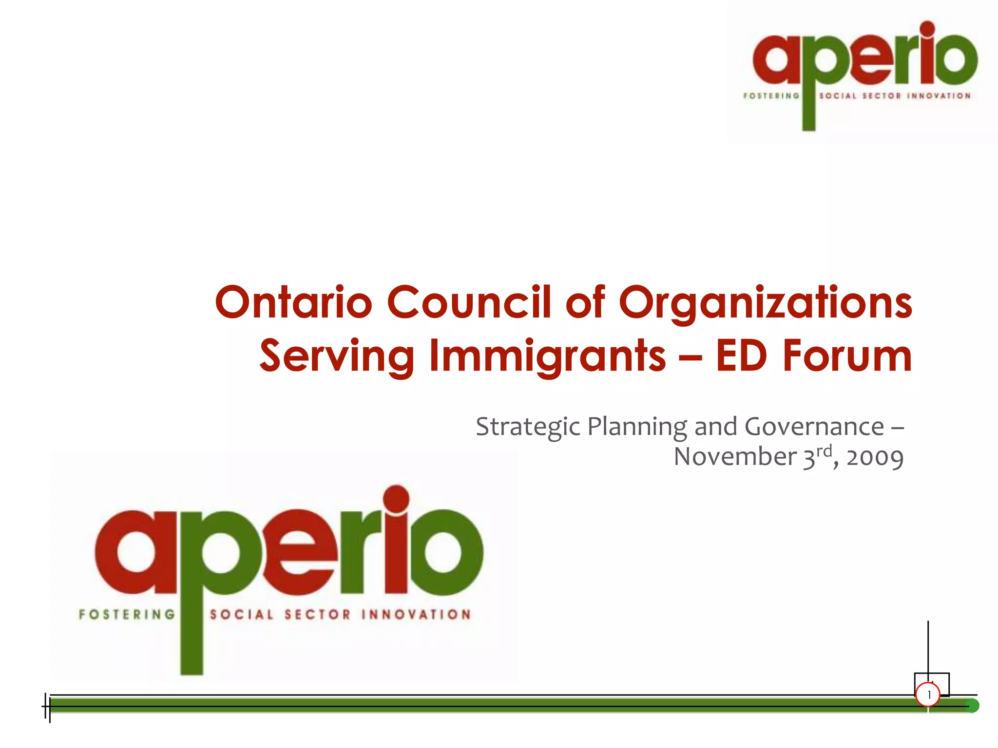 The document outlines a strategic planning process for a nonprofit organization serving immigrants. It discusses setting a vision and mission, analyzing strengths/weaknesses, and defining strategic priorities and goals. Key priorities identified include diversifying funding, growing the budget, providing high quality services, and meeting community needs regardless of ability to pay. Governance principles are to ensure the board adds value, conducts oversight, and ensures accountability and transparency. The process aims to create a future state and strategic plan to guide the organization.
