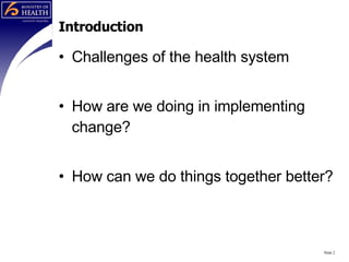 This document discusses challenges facing the New Zealand health system and opportunities to improve information technology (IT) governance and implement shared services. It notes a highly complex health system with over 3,000 GPs, 82 health organizations, and IT investments accounting for over 9% of GDP. Questions are raised about coordinating change across stakeholders and leveraging scale through a common approach to services. The key barriers to shared services need to be addressed and next steps identified to make progress on this. Strong IT governance is important, clarifying decision rights, accountability, investment priorities, and architecture to encourage better coordination and outcomes from IT.