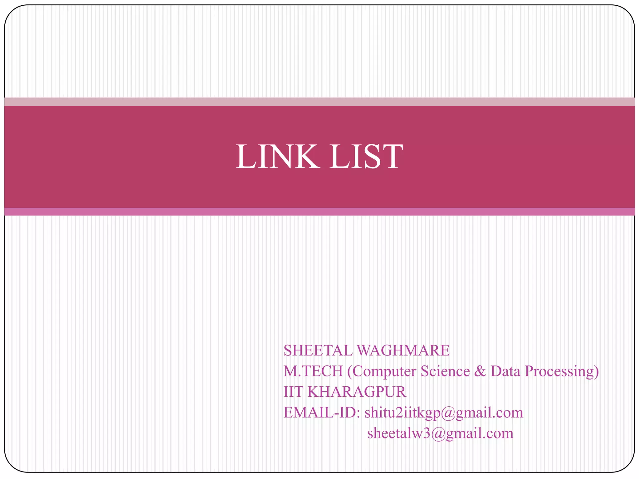 The document is a comprehensive presentation by Sheetal Waghmare on linked lists and their implementation in computer science, particularly focusing on data structures like singly linked lists, doubly linked lists, and various operations such as insertion, deletion, and searching. It discusses the advantages of linked lists over arrays, highlighting issues like fixed size and slower operations in arrays. The document also includes details on different types of linked lists, their anatomy, and algorithms for manipulating these data structures.