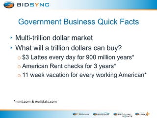 The document outlines how to find and bid on government contracts at various levels, emphasizing that the U.S. government is the largest buyer of goods and services globally. It highlights opportunities for small and minority-owned businesses, the vast scope of government purchases, and the benefits of government contracts, such as multi-year agreements and prompt payments. Additionally, it mentions BidSync as a resource for tracking nearly 1 million bid releases annually through various channels like the internet and direct invitations.