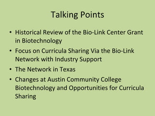 Bio-Link is a National Science Foundation-funded center focused on increasing the number and diversity of biotechnology technicians through educational programs and industry partnerships. Over 12 years, Bio-Link has expanded its regional network across Texas community colleges and high schools. It provides resources like curriculum sharing and faculty training to strengthen biotechnology education programs nationwide and help students transition into industry careers. Recent goals include expanding partnerships, utilizing new communication tools, and offering courses both online and in coordination with industry needs.