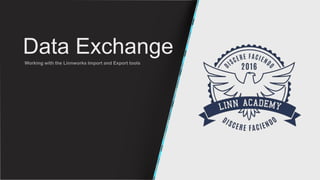 This document discusses data exchange in Linnworks, including importing, exporting, and querying data from third party sources. It covers setting up scheduled or instant uploads and extractions of data in a consistent CSV format. The presentation provides rules for the CSV file format, such as avoiding scientific notation, properly formatting special characters, using unique column headers, and including default values, expressions, and extended properties. It also discusses automating data exchange on schedules and running ad hoc query reports to access data as needed.