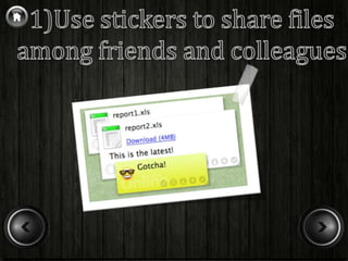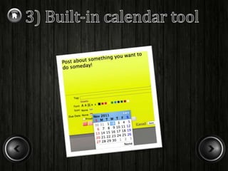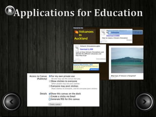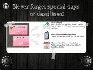 Lino It allows users to organize their goals and share information by creating digital sticky notes that can be embedded on blogs and shared online. It stimulates collaboration through features that allow users to take notes, post pictures and videos on their notes, and view them on dashboards accessible through desktop and mobile widgets. The tool aims to integrate sticky note capabilities into users' daily work, life, and study.