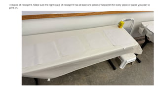 This document provides detailed instructions for preparing and operating a printing press, including setting up tools, inking plates, and executing the printing process. Key steps involve ensuring proper alignment, setting pressure, and cleaning tools between prints to maintain quality. Additionally, it emphasizes the importance of documenting print order and imperfections, as well as proper cleanup techniques after printing.