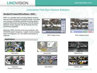 Linovision offers a range of fish-eye cameras with a 360° panoramic view suitable for various surveillance applications. The cameras can be paired with their NVR+ software, which supports multiple de-warping options and flexible recording features. NVR+ also integrates various functionalities such as POS/ATM systems and allows for extensive customization.