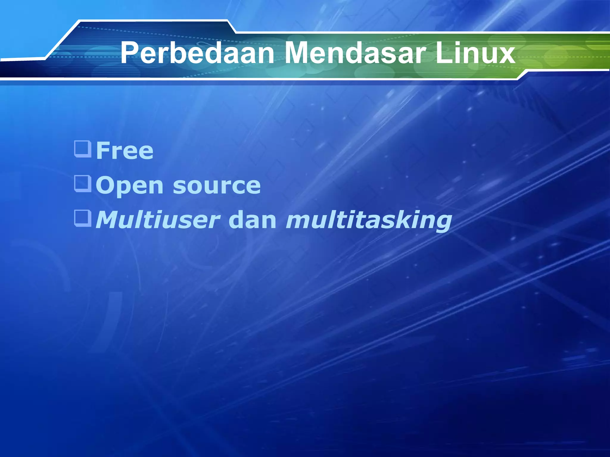 Dokumen ini membahas tentang Linux sebagai sistem operasi yang free, open source, multiuser, dan multitasking, serta perbandingannya dengan sistem operasi lain seperti Unix, MS-DOS, dan Windows. Linux memiliki kelebihan dalam manajemen proses, memori, dan efisiensi, serta mengimplementasikan prinsip desain Unix. Terdapat juga penjelasan mengenai penjadwalan proses dan jenis-jenis proses di Linux.