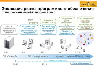 Документ описывает деятельность Гну/Линуксцентра под руководством Павла Фролова, включая издание и поддержку свободного программного обеспечения (СПО), а также проекты в области внедрения СПО в России. Основное внимание уделяется преимуществам использования СПО для государственных структур и бизнеса, включая независимость от иностранных поставщиков и возможность кастомизации. Также рассматриваются успехи и вызовы, с которыми сталкиваются компании и сообщества в области свободного ПО.