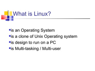 Linux is an open-source operating system based on Unix. It is robust, scalable, stable, and secure. Linux was originally developed in 1991 by Linus Torvalds and is freely available. Common Linux distributions include Red Hat, Debian, SUSE, and Gentoo. When installing Linux, important steps include identifying compatible hardware, determining the installation method, configuring partitions, and selecting packages to install based on the intended use of the system.