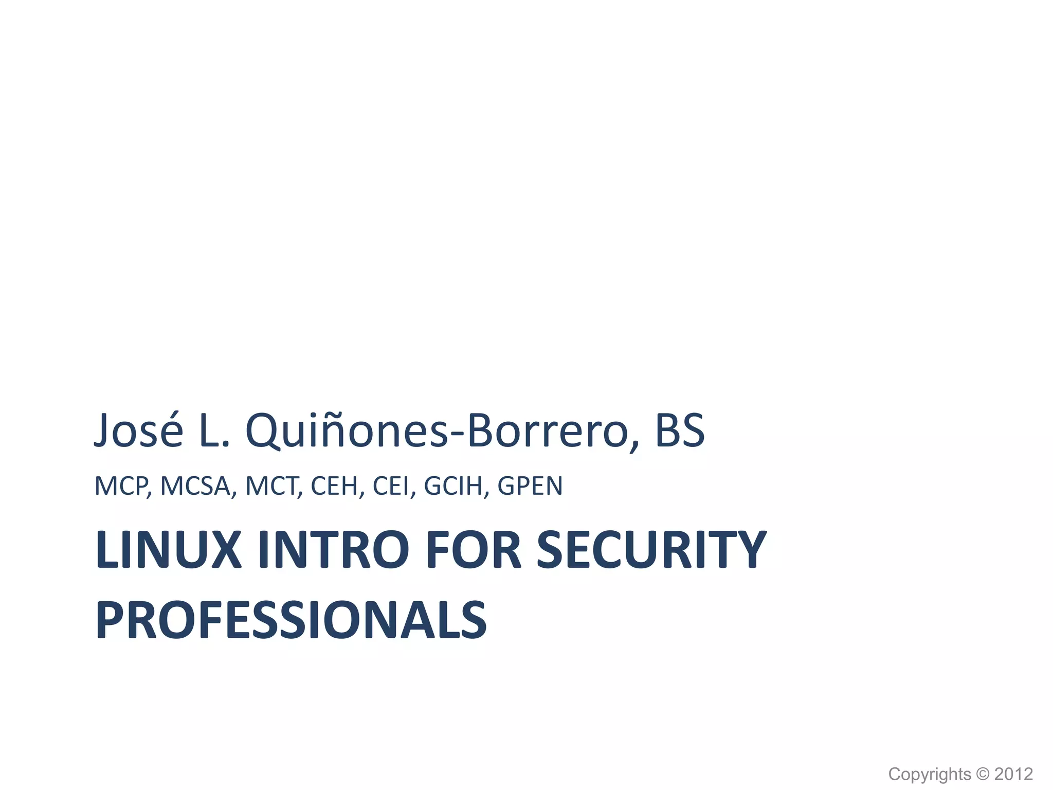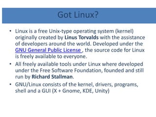 This document provides an introduction to Linux for security professionals. It covers topics such as the Linux directory structure, installing and managing packages, command line tools for system reconnaissance, user and process management, networking configuration, and more. The document is intended to familiarize readers with fundamental Linux concepts and commands relevant to security work.