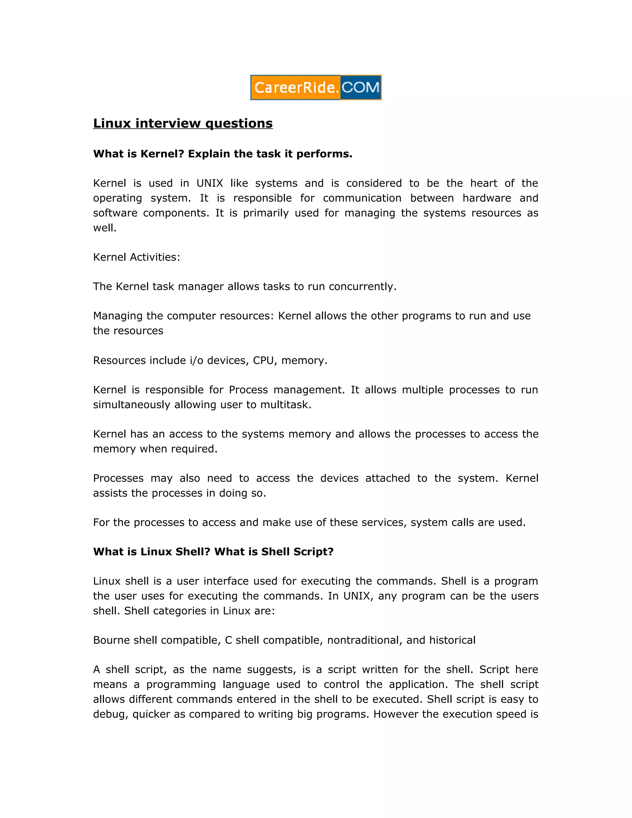 The document discusses various Linux interview questions and their answers. It covers topics like the kernel and its functions, Linux shells and shell scripts, pipes, trap, shift and getopts commands, stateless Linux servers, nslookup and its modes, the Bash shell, network monitoring tools, Linux file systems, process states and system calls for process management. More interview questions and answers can be found at the provided link. The content is provided as is without a warranty.