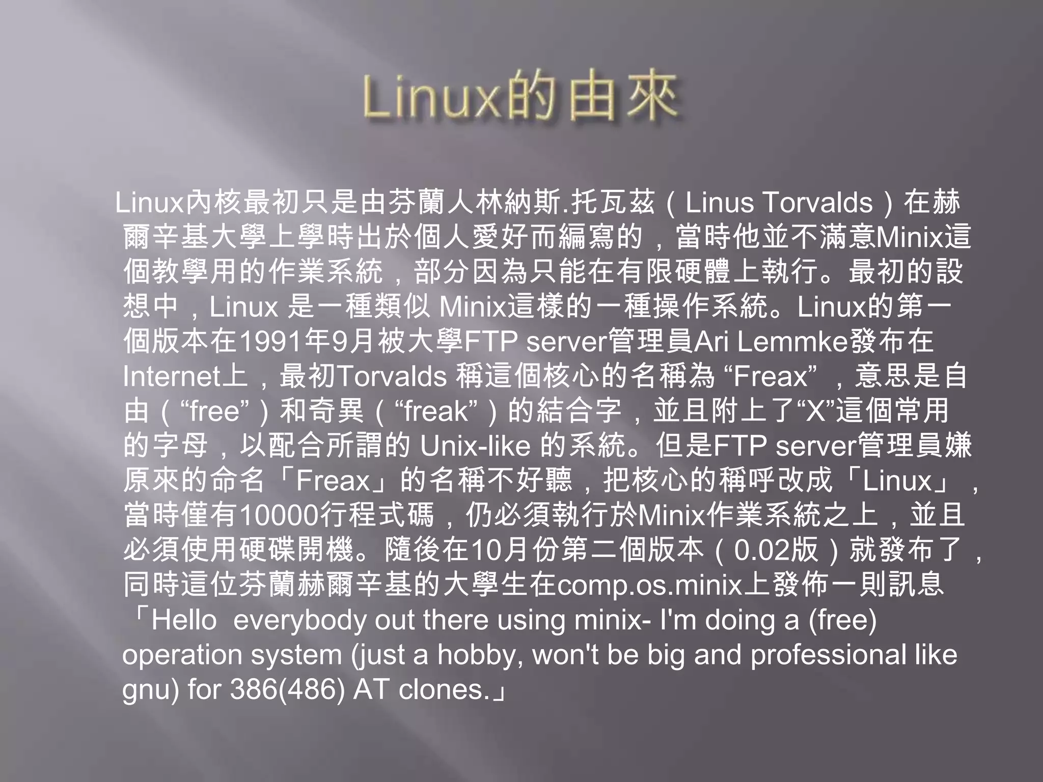 Linux的由來 Linux內核最初只是由芬蘭人林納斯.托瓦茲(LinusTorvalds)在赫爾辛基大學上學時出於個人愛好而編寫的,當時他並不滿意Minix這個教學用的作業系統,部分因為只能在有限硬體上執行。最初的設想中,Linux 是一種類似 Minix這樣的一種操作系統。Linux的第一個版本在1991年9月被大學FTP server管理員Ari Lemmke發布在Internet上,最初Torvalds稱這個核心的名稱為 “Freax” ,意思是自由(“free”)和奇異(“freak”)的結合字,並且附上了“X”這個常用的字母,以配合所謂的 Unix-like 的系統。但是FTP server管理員嫌原來的命名「Freax」的名稱不好聽,把核心的稱呼改成「Linux」,當時僅有10000行程式碼,仍必須執行於Minix作業系統之上,並且必須使用硬碟開機。隨後在10月份第二個版本(0.02版)就發布了,同時這位芬蘭赫爾辛基的大學生在comp.os.minix上發佈一則訊息「Hello everybody out there using minix- I'm doing a (free) operation system (just a hobby, won't be big and professional like gnu) for 386(486) AT clones.」