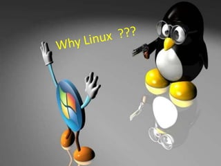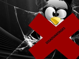 Linux is an open-source, Unix-like operating system that runs on multiple hardware platforms. There are over 350 Linux distributions available including popular options like Ubuntu, Fedora, Debian, and Red Hat. Linux distributions are suitable for different users, with Ubuntu being good for all levels of users. Linux offers advantages like low cost, reliability, security, and built-in applications, but also has drawbacks like sometimes being not user-friendly and having limited hardware support and applications for computer gamers. Linux is widely used in servers, supercomputers, desktops, laptops, and many other devices.